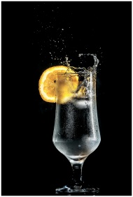 Dazzling cold cocktail with citrus slice splash, set against a dramatic black background.