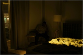 An adult man experiencing insomnia, sitting in a dimly lit bedroom corner at night.