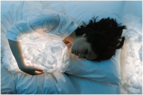 Woman in white long sleeves hugging a glowing pillow while resting in bed, creating a dreamlike atmosphere.