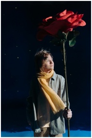 A child dressed as the Little Prince holds a giant rose under a starry sky.