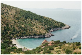 A picturesque coastal cove with a lush hillside and clear blue waters, ideal for travel enthusiasts.