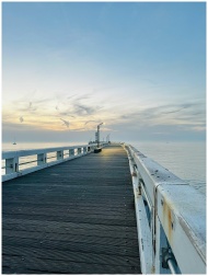Tranquil pier with sunrise over calm ocean, perfect for peaceful escapes.