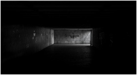 A dimly lit tunnel with graffiti and concrete walls evokes mystery and solitude.