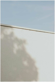 Shadow pattern on a white wall with a clear blue sky creates a minimalist aesthetic.