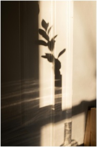 Shadow on white wall of stem with leaves in glass vase in sunlight