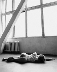 Artistic black and white photo of a woman lying in a studio with large windows.
