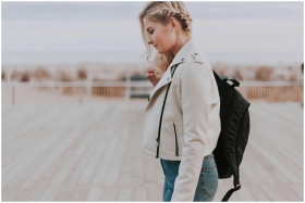 A young woman in a leather jacket walking on a boardwalk, embracing a casual and stylish vibe.