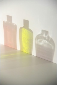Creative composition of colorful bottle shadows cast on a wall, ideal for design and health themes.