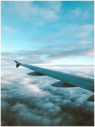 Aerial view of an airplane wing flying over fluffy