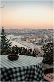 Round table covered with green checkered tablecloth in outdoor cafe with amazing city view during sunset