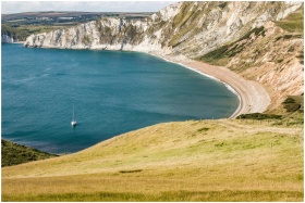 Beautiful view of a coastline with cliffs, a sandy beach, and a lone sailboat at sea.