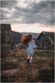 A young girl runs through a rustic countryside lan