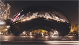Chicago's iconic Cloud Gate sculpture reflecting a vibrant cityscape at night.