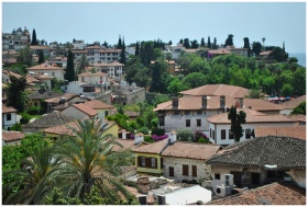 Panoramic view of Antalya's historic roofs and palm trees on a sunny day with lush greenery around.