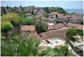 A captivating view over the rooftops of Antalya's historic Kaleici district with lush greenery and sea in the background.