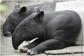 A pair of Malayan tapirs lying down, showcasing th