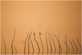 Two birds perched on sticks amid calm waters at sunrise create a tranquil wetlands scene.