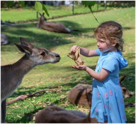 A young girl interacts with a kangaroo in Fig Tree