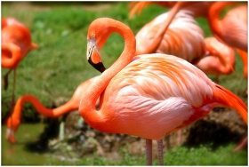 Close-up of a vivid flamingo standing gracefully among grass and water.