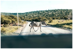 View from inside vehicle of zebra and herd of ante
