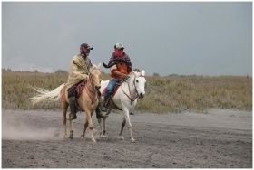 Two men on horseback riding across the dusty fields in East Java, Indonesia.