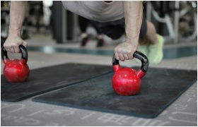 Close-up of a man doing plank push-ups using kettl