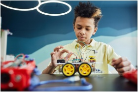 Boy explores robotics with toy vehicle and wires in a classroom setting.