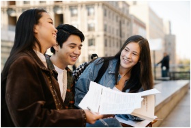 Three young adults sitting on campus benches, enjoying their conversation.