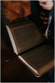 A mystical scene with an open book and a wand, suggesting witchcraft or magic.