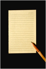 A vertical shot of lined paper and a wooden pen on a black background offering ample copy space.
