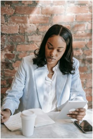 A focused woman in a blazer takes notes on a table