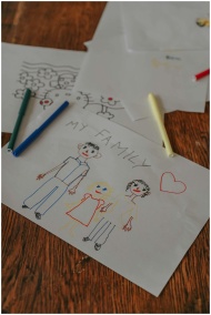 A child's drawing of a family on paper surrounded