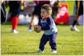 Joyful toddler playing with a football on a sunny