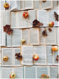 Creative flat lay of open books with scattered apples and autumn leaves, perfect for natural decor.