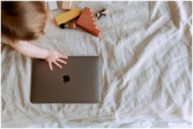 From above of crop faceless child sitting on bed with scattered multicolored details of wooden constructor and touching closed laptop with hand
