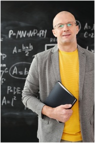 Smiling teacher standing in a classroom holding a notebook with blackboard equations.