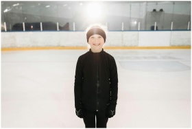 A young girl smiling on an indoor ice skating rink, dressed warmly.