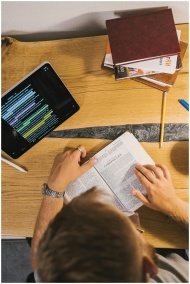 Person reading a Bible at a desk with a tablet and notebooks, emphasizing study and contemplation.
