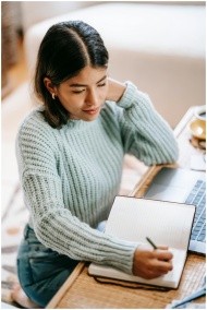 Hispanic woman studying with a laptop and notebook at home, creating notes.