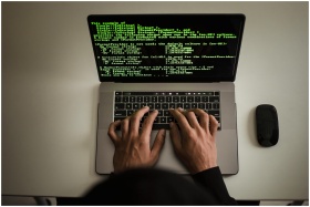 From above crop anonymous male programmer in black hoodie working on software code on contemporary netbook and typing on keyboard in workspace