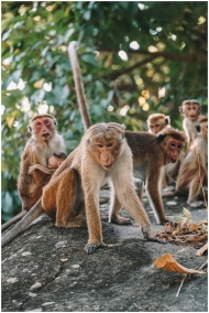 Group of wild monkeys on a rock surrounded by trees in their natural habitat.