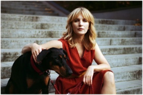 Elegant woman in red dress sitting with Doberman on outdoor stairs.