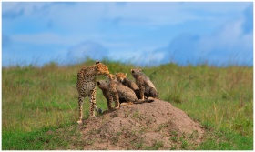 Cheetah mother with cubs on a mound in African sav