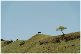 A cow grazes on a vibrant green hillside surrounde