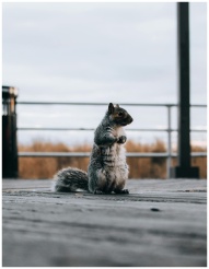A gray squirrel standing on a wooden deck with a blurred outdoor background. Captured during autumn.