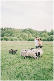 A couple embraces joyfully among sheep in a lush,