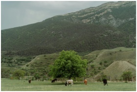Idyllic countryside with cows grazing under a tree on a mountain backdrop.