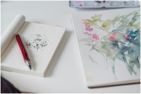High-angle view of a sketch and watercolor paintin