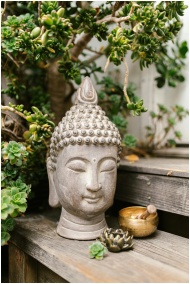 Buddha statue surrounded by lush greenery and meditative objects, ideal for peaceful garden themes.