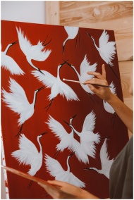 A painter adds details to a red canvas depicting elegant white cranes in flight.